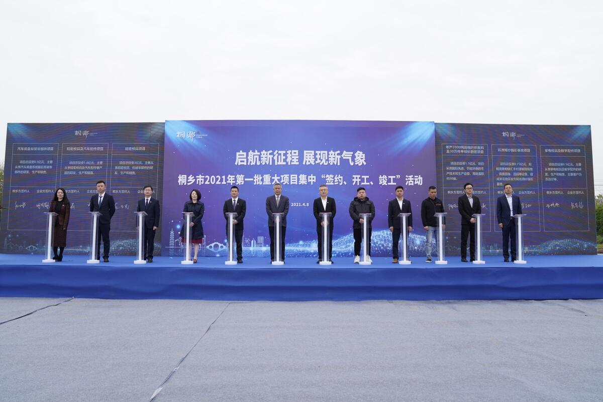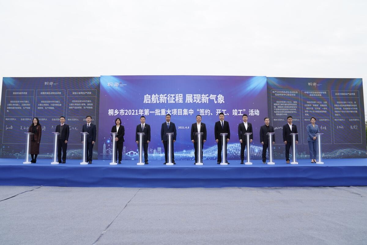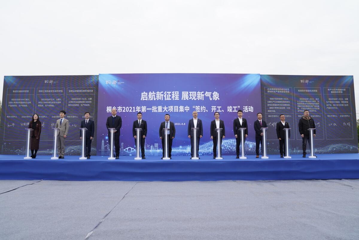 凝心聚力抓經濟,唯實惟先促發展。4月8日上午,桐鄉市舉行“啟航新征程,展現新氣象”2021年第一批重大項目集中“簽約、開工、竣工”活動,96個重大項目集中簽約或開竣工,總投資356.9億元,以項目為主抓手,奏響“春天奮進曲”。桐鄉市領導齊力、潘川弟、蔣惠玲、姜瑋、朱偉強等出席活動。